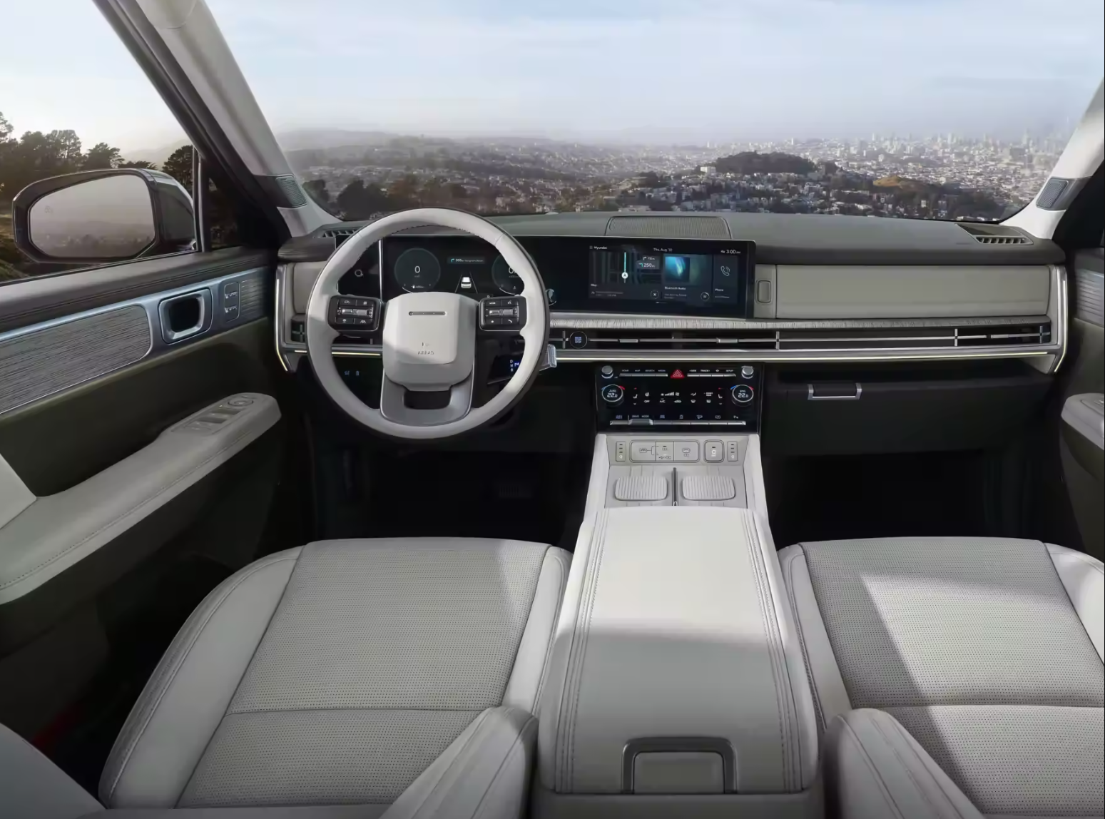 How about the infotainment system and connectivity? The 2024 Hyundai Santa Fe boasts an expansive dashboard with two 12.3-inch displays—one for the gauge cluster and another as a touchscreen for infotainment. Despite the screen emphasis, practical physical knobs for climate and audio volume control remain for user convenience.